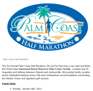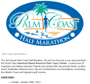 Our good friends recently moved there (Flagler Beach – 11 miles away) so we will get the chance to see them.  My hubby & I would arrive Saturday (the day before the race) and leave Wednesday. (I even have Jan 21 off from work.)