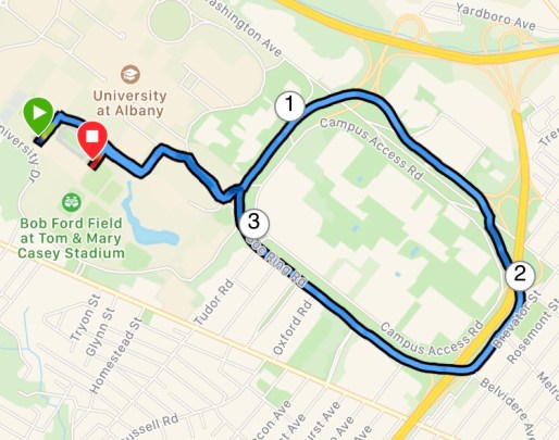 The course is just a loop starting and ending at the college campus. In the middle you are running around a NYS Office campus. There are rolling hills here and there and lots of wind.