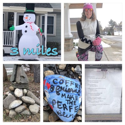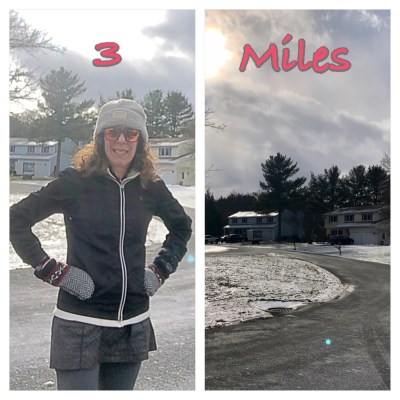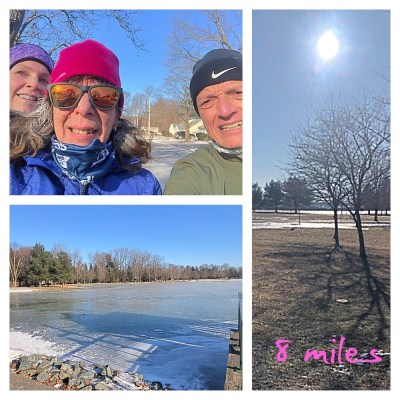 - Sunday – Last long run before the big day. Only 8 miles on my “plan.” Plan in parentheses because after 53 half marathons, I don’t have a plan lol. My running group has shrunk for various reasons (snowbirds, illness, injury) but Karen and Stan agreed to tackle the freezing temps with me.
