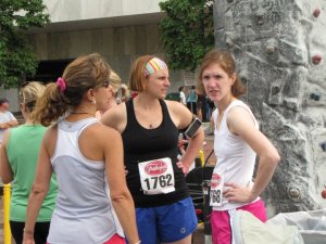 I decided to not park in the crowded parking lot and I parked at work and walked to the race. It was way farther than I thought – about a mile and a half so I arrived late for our meet up and I was already HOT! I also left my iPod in my car and LOST my BondiBand on the way.